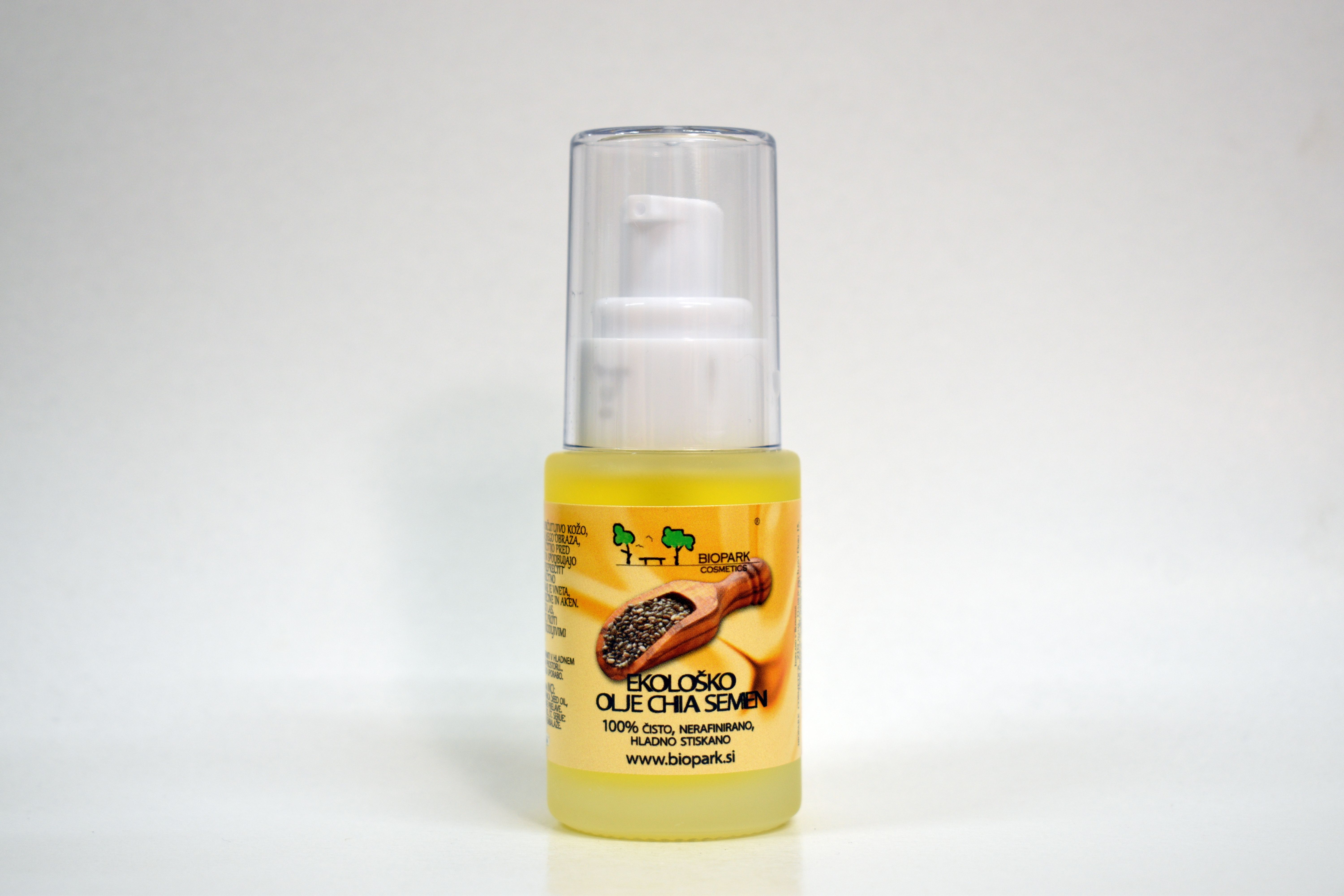 Opis: Hladno stisnjeno iz semen chia, zlatorumene barve z blagim, prijetnim vonjem. Na koži pusti svileno mehak občutek.